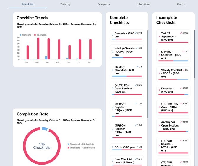 2. Go to Checklists. Set your timeframe or date range. Please be patient as the system processes the report.