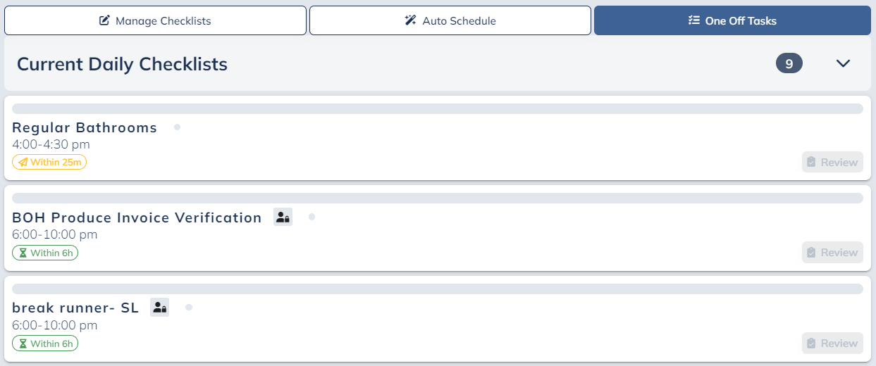 A time stamp indicator will let you know when the checklist needs to be complete. The stamps follow the same rules as the break stamps, but for checklists.