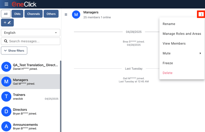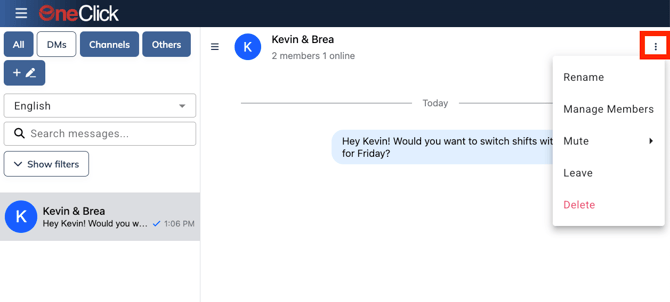 Note: As Team Members are added/removed or promoted/demoted, they will automatically be updated in the chats. For instance, Drew is promoted to Shift Leader. Once his permission is set in OneClick, he will automatically be added to the Shift Leader Channel. If Mary is marked as terminated, she will automatically be removed from the chat.